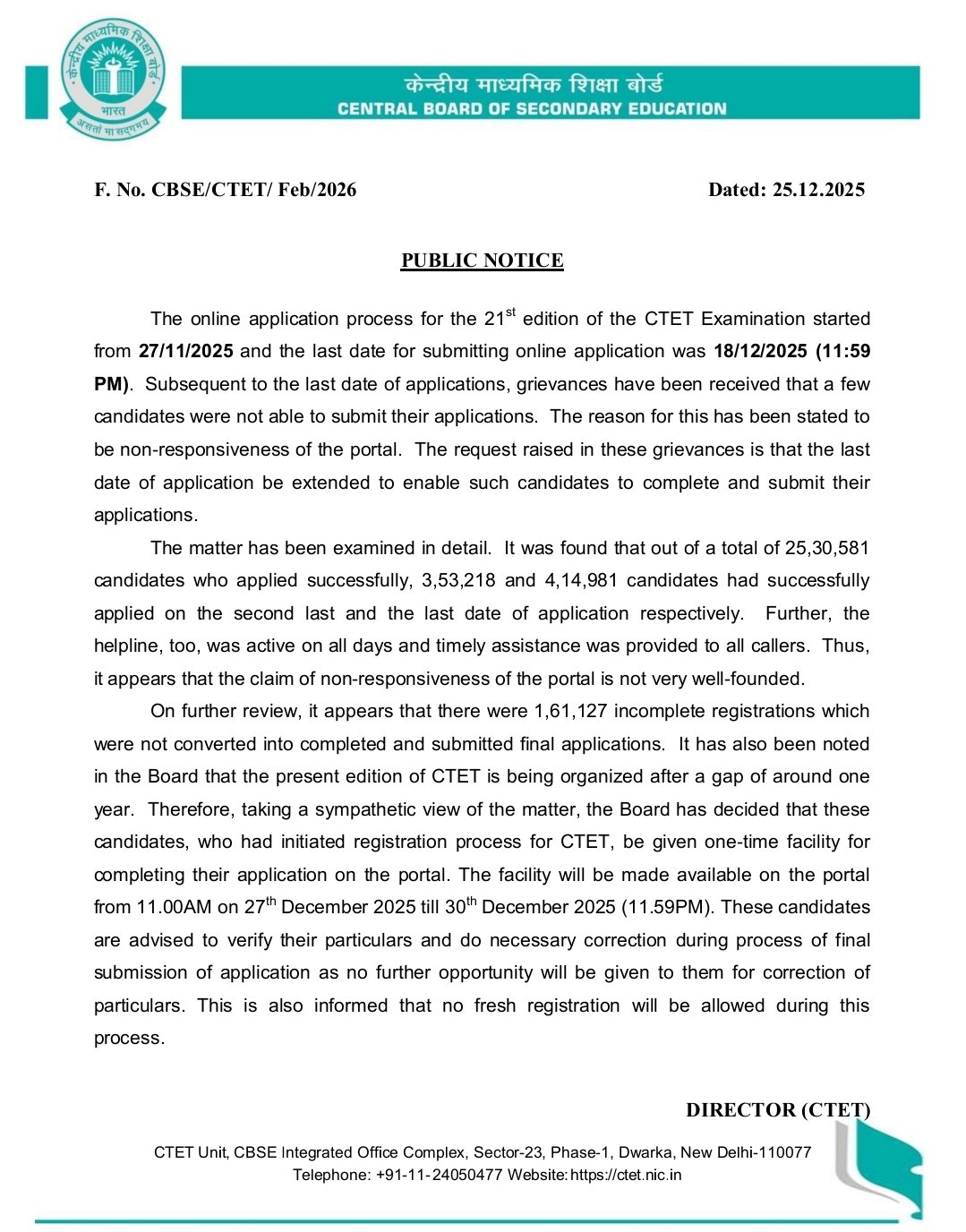 CTET February 2026 के लिए Online Application Process 27 November 2025 से start हुआ था और Last Date 18 December 2025 रखी गई थी। Exam 08 February 2026 को conduct किया जाएगा।