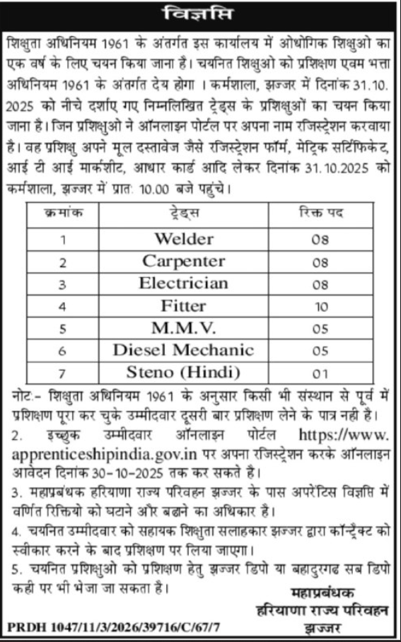 - “Haryana Roadways Jhajjar Apprentice Recruitment 2025” Notification PDF Download करें।