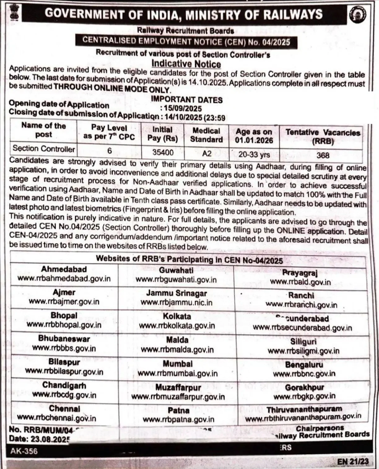 RRB Section Controller Application Status 2025 Out – 368 Posts Status Check : Railway Recruitment Board (RRB) ने RRB Section Controller Recruitment 2025 के लिए आवेदन करने वाले सभी उम्मीदवारों का Application Status 2025 आधिकारिक रूप से जारी कर दिया है। यह Application Status 12 December 2025 को जारी किया गया है।
